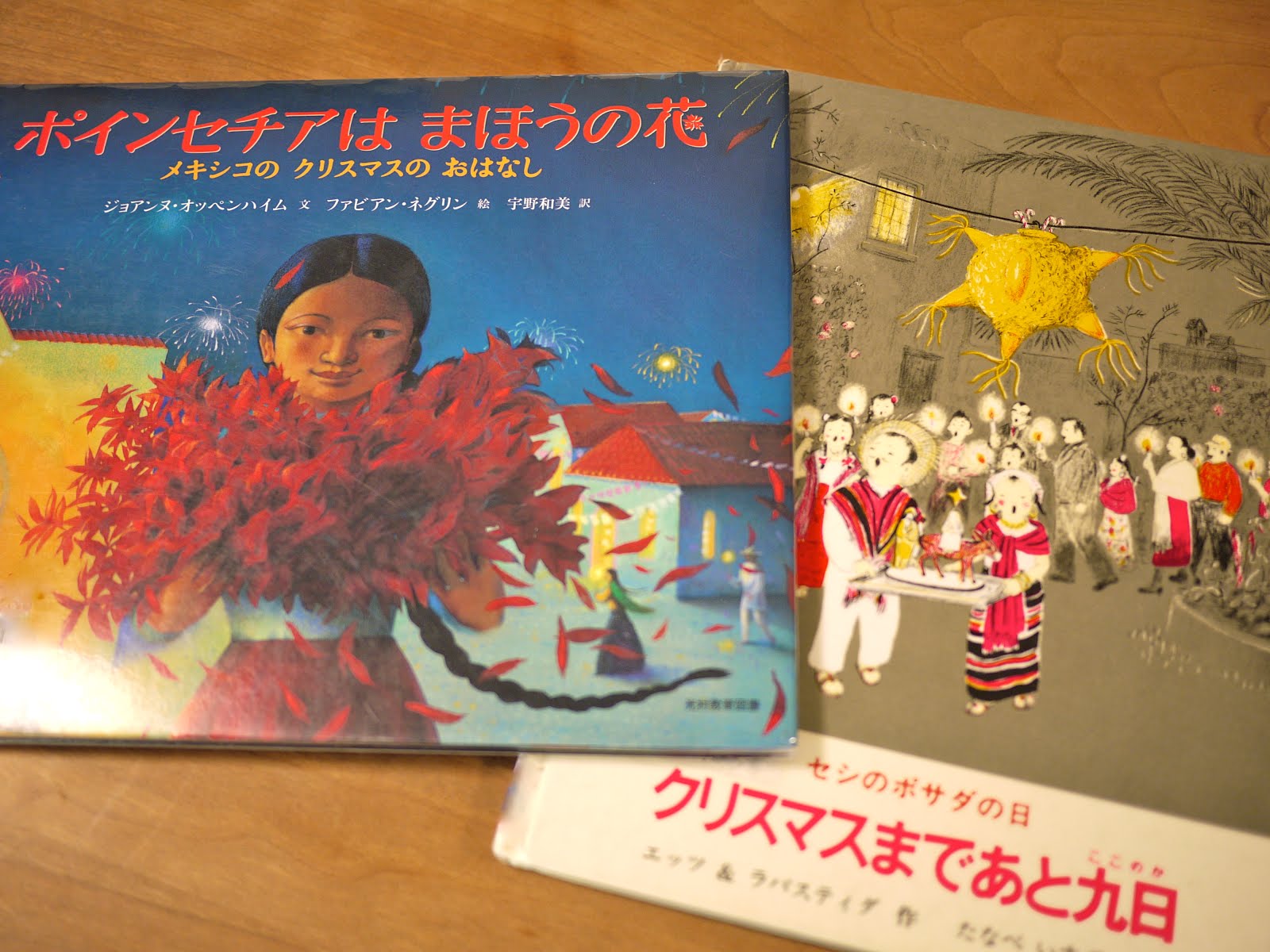 絵本の中のパペルピカド メキシコの切り紙パペルピカドは、お祭りやパーティで飾られたり、土産品として売られていますから、メキシコを訪れた人なら色とりどりの万国旗のようなそれを、かならず目にするのではないでしょうか。じつは絵本の中にもパペルピカドを見つけることができます。図書展で展示した『ポインセチアはまほうの花』と『クリスマスまであと九日』の二冊はメキシコを舞台にした絵本で、前者の挿画には印象的に、後者ではさりげなく、パペルピカドが描きこまれています。